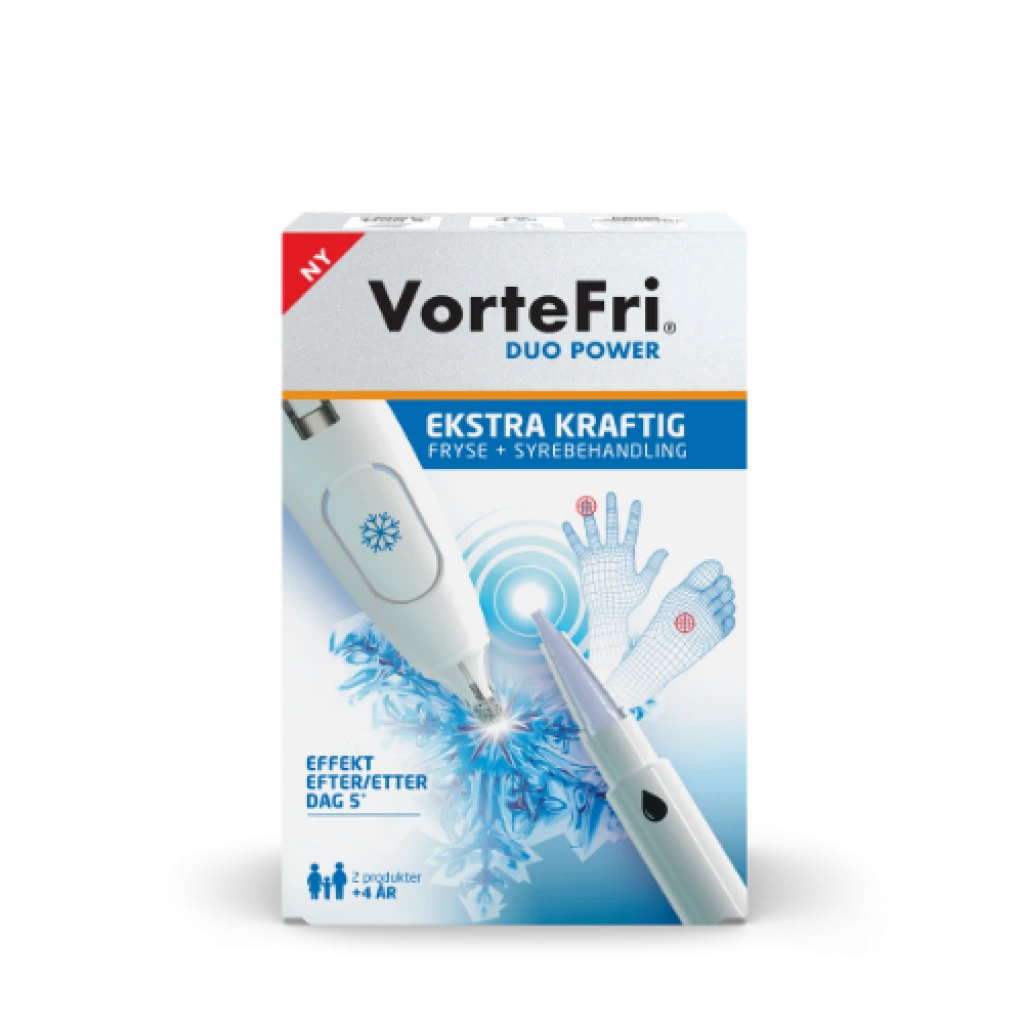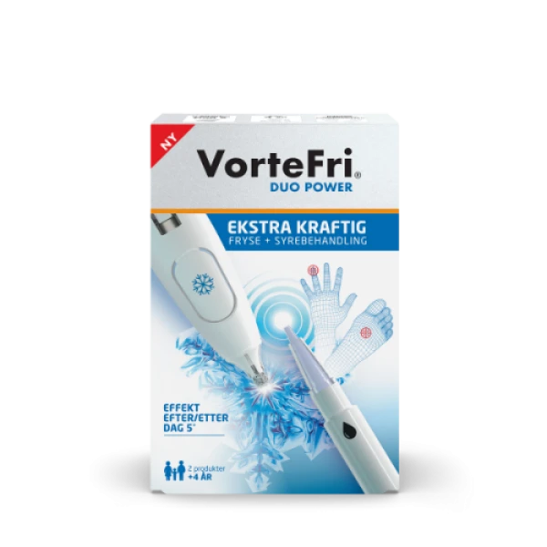 VorteFri® DUO POWER er en ekstra kraftig kombinationsbehandling til hjemmebrug som indeholder to enheder: en frysepen og en gelsyrepen. Frysepennen er baseret på den frysemetode, der normalt anvendes af praktiserende læger, som fjerner vorten ved hurtigt at fryse vortens kerne. Gelsyrepenen indeholder en koncentreret kaustisk formulering med trichloreddikesyre, der har en eksfolierende effekt på vorten. Under behandlingen bliver huden mørkere og begynder at skalle, og der dannes en sårskorpe. Eksfoliering er en naturlig proces og fortsætter i 1 til 2 uger efter behandlingen. Produktet kan anvendes til hele familien fra 4 år til behandling af vorter på hænder og fødder. Læs brugsvejledningen i pakningen grundigt inden brug.