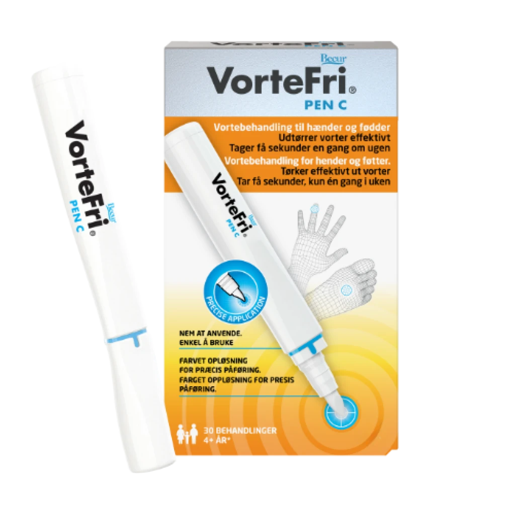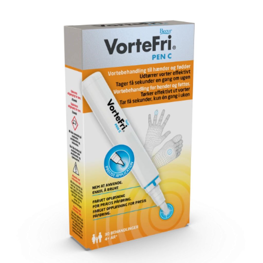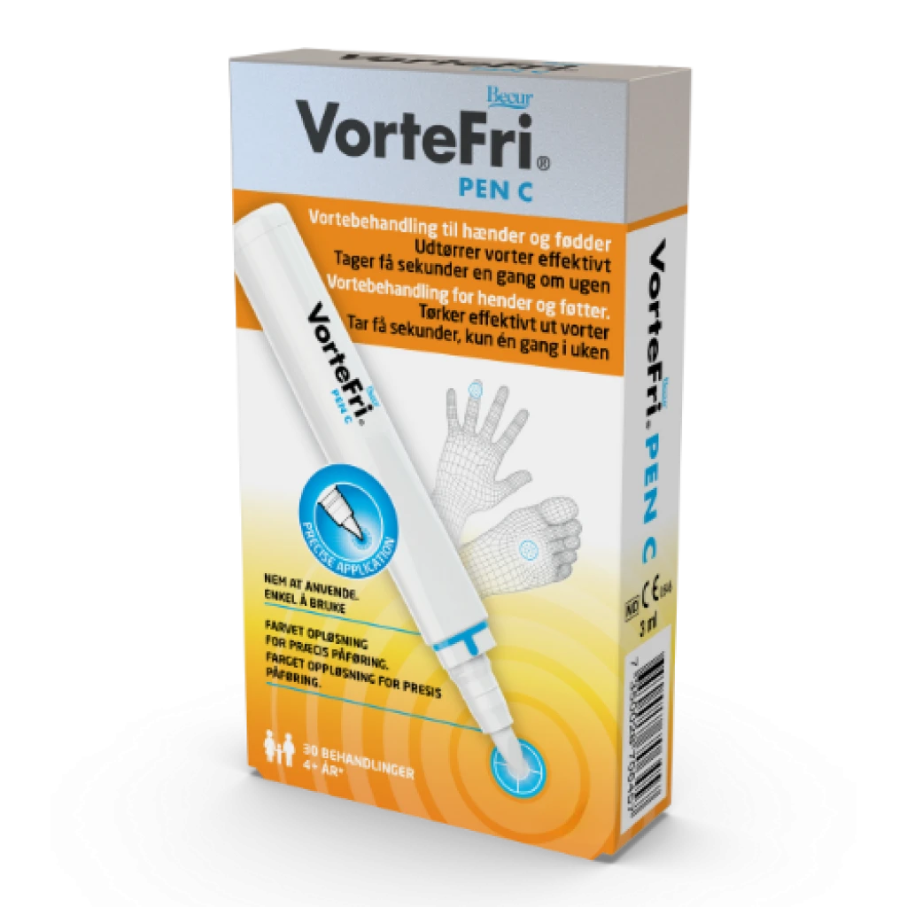 3 mlVorteFri® PEN C indeholder en kraftfuld myresyreopløsning tilsat lidt farve. Opløsningen trænger ind i vorten med det samme og tørrer den ud, hvilket får kroppen til at afstøde vorten. Opløsningen i pennen afgiver en lille mængde farve for at guide og sikre, at den påføres korrekt på vorten. Med VorteFri® PEN C er det muligt at behandle én eller flere små vorter samtidig.